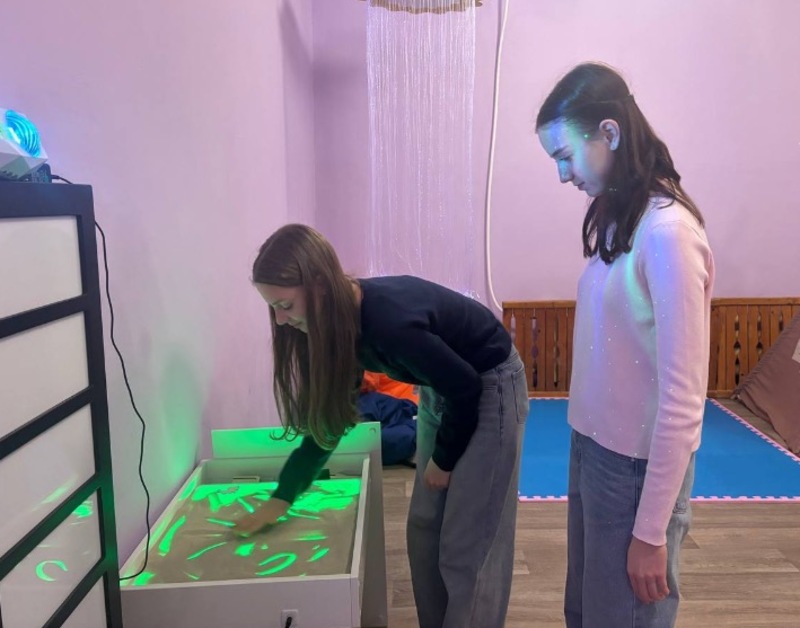 Заведующая детского сада продемонстрировала нам уникальные возможности сенсорной комнаты, оборудованной специально для малышей с особыми нуждами. Здесь ребята могут рисовать на песочной доске, наблюдать волшебный звездный дождь, ходить по специальным дорожкам, тренирующим координацию и восприятие.
