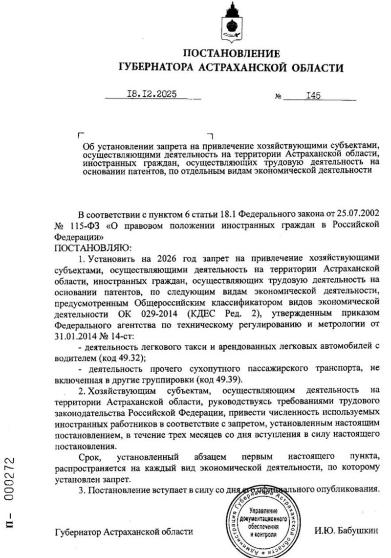 Соответствующее постановление подписано губернатором Астраханской области. Согласно документу, в 2026 году нельзя будет привлекать к работе в такси, автобусах и маршрутках иностранцев, которые имеют трудовые патенты. Помимо этого, работодатели региона должны привести численность зарубежных сотрудников в соответствие с законом.
